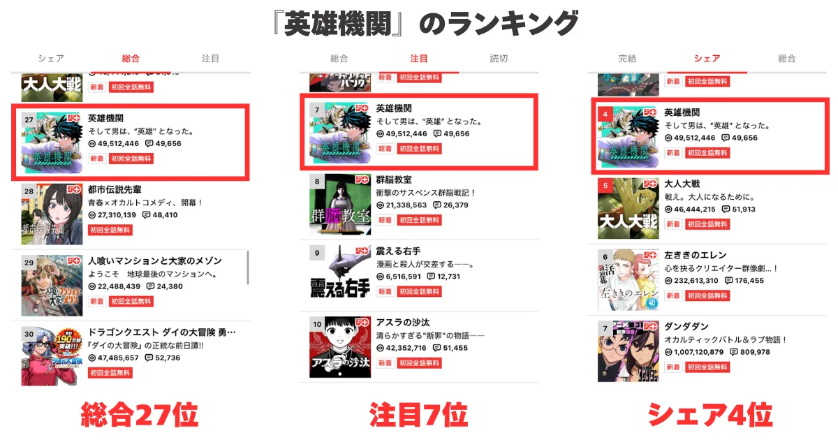 実際にジャンプ+のアプリ内のランキングで「総合27位」「注目7位」「シェア4位」を獲得しています。