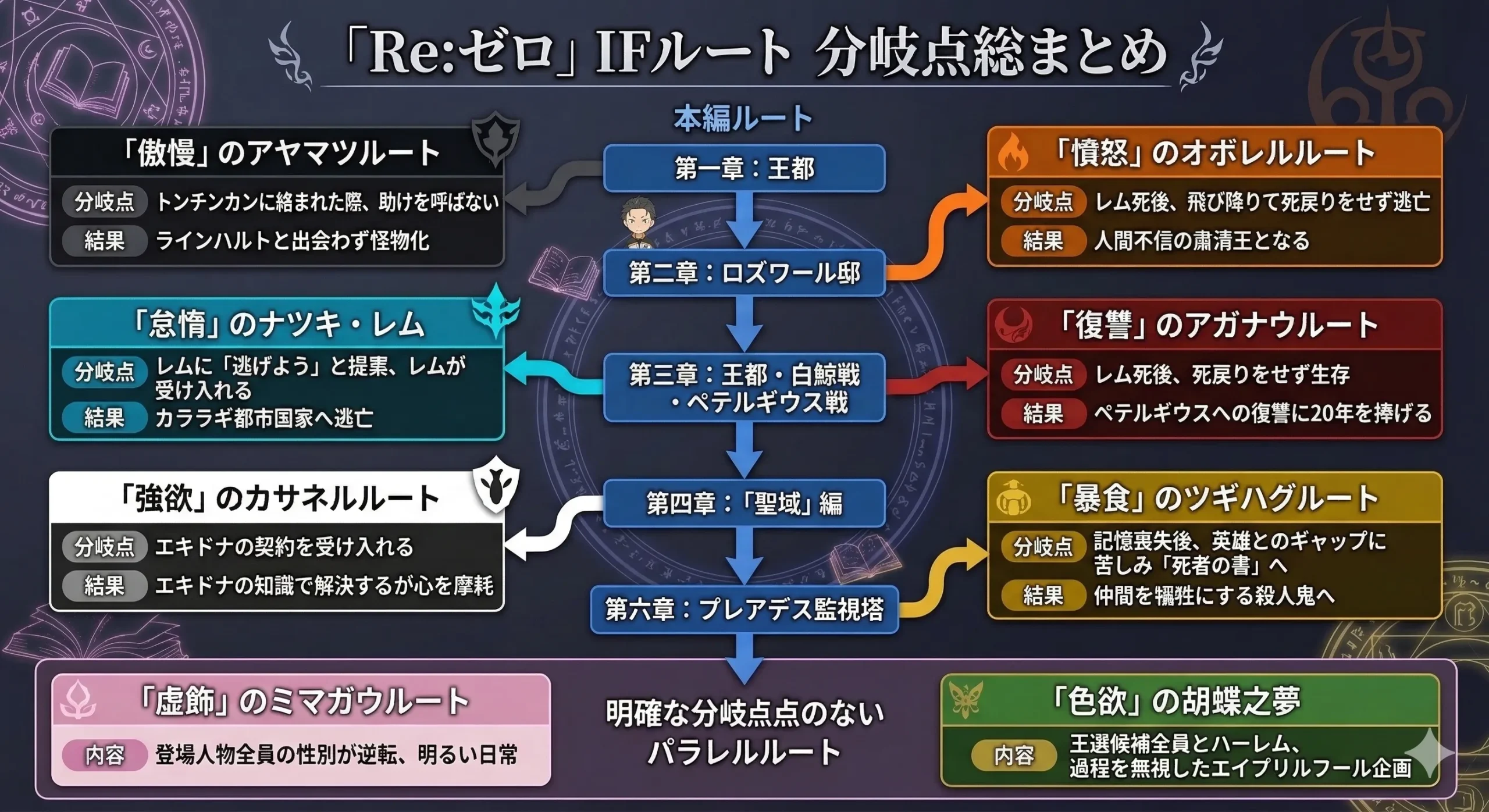 リゼロのIFルートは、本編の「嫉妬」を含めない「七つの大罪」をテーマに、様々な種類が存在します。