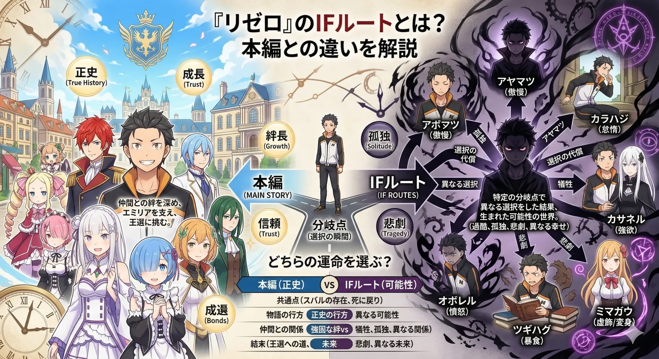 この分岐によってナツキ・スバルの性格や運命は劇的に変貌し、本編とは全く異なる道を歩むことになります。